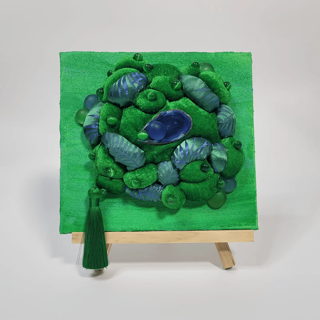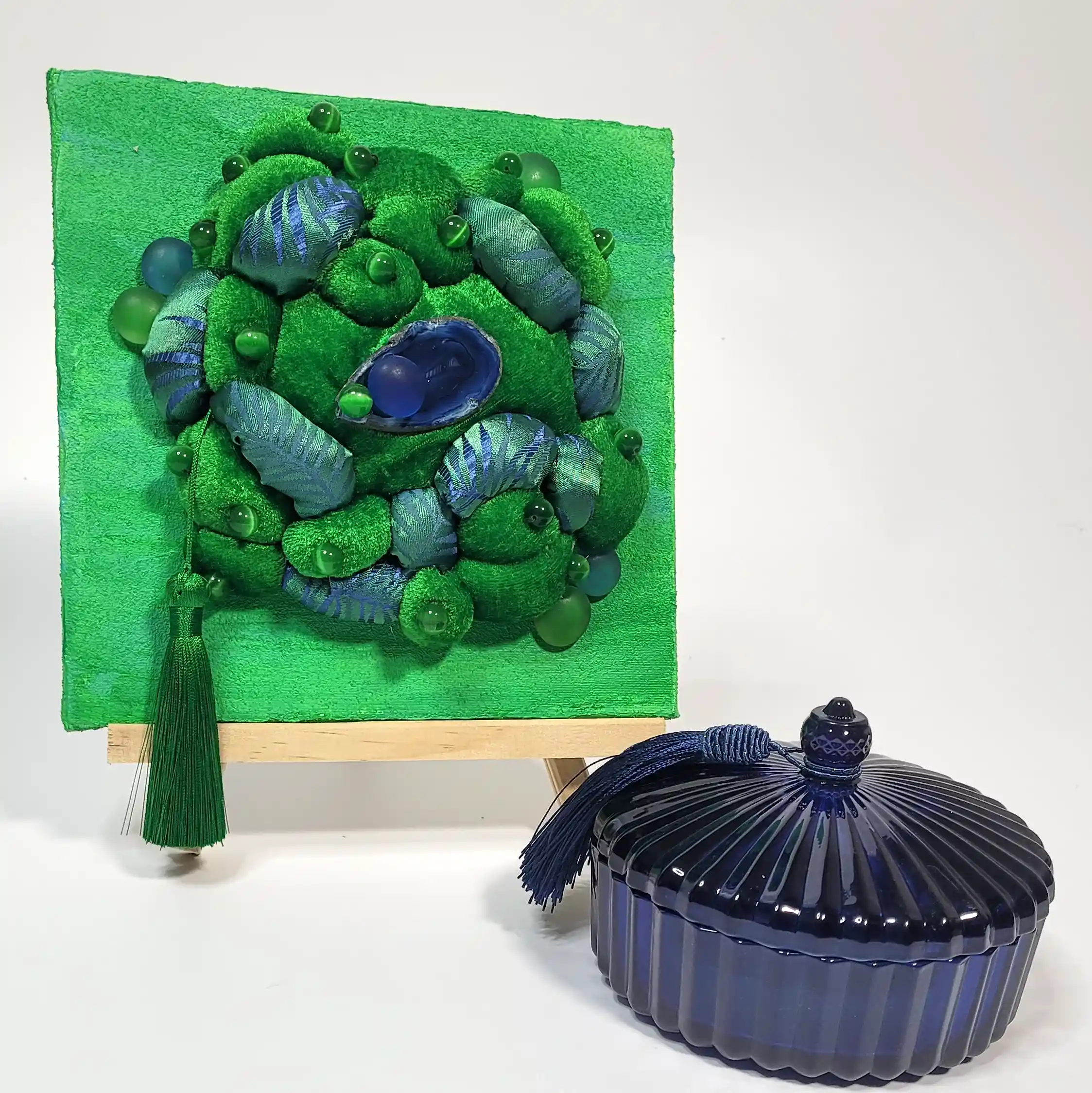 Велюр додає тактильності та відчуття захищеності. Зелений колір традиційно пов’язаний із серцевим центром, темою прийняття та внутрішнього балансу.